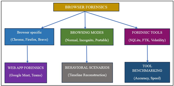 The web app forensics more emphasising on enterprise video conferencing was another remarkable area as well. Researchers who analyzed Google Meet sessions in Chrome and Mozilla Firefox unveiled a slew of artifacts from meeting IDs and participant listings to cached thumbnails and chat logs stored in browser caches and local repositories. Team vs GoToMeeting comparisons also give insight that the Teams had retained vastly more highly detailed, highly structured traces, with GoToMeeting artifacts largely being cached chunks of video or audio. The results demonstrate that communication applications are a treasure trove of rich forensic evidence because we need to utilize specialized procedures as the applications differ to such an extent Iqbal et al. (2022), Khalid et al. (2022). Based on the browser forensic evidences, investigators can study the behaviour and can reconstruct the timelines and can established the motives behind its actions. It gives comprehensive detail about user’s financial activities, social connections by the help of pirating files in combination with memory screenshots and system logs, and with browser artifacts produced by the user itself unknowingly. These techniques bring the effectiveness of browser forensics from data finding to an understanding of intent and context, of value in corporate as well as legal investigations Chand et al. (2025).