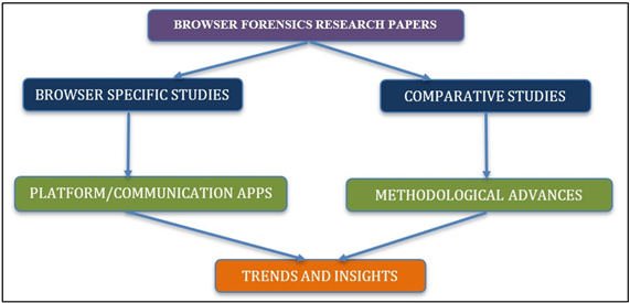 Research studies are extensively based on its relevance, forensic information, and methodology used. Studies are grouped into: browser focused studies, comparison studies, application based forensic studies and methodology based.