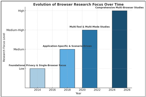 Earlier works (pre-2018) generally consisted of controlled surfing in one mode or browser, with subsequent disk analysis Tiwari and Kashyap (2025). The intermediate phase witnessed the popularity of scenario-based testing Figure 3 for particular applications such as cloud services and Discord Motyliński et al. (2020), Adesina et al. (2022). Some studies utilize factorial designs that test in parallel more than one browser, browsing modes (normal, portable, private), and forensic instruments. This facilitates strong comparative inferences about the persistence of artifacts as well as the effectiveness of tools that could not by and large be made in prior, more limited works. Cumulative basic browser mechanics research accounts for a full 65%—either through generic comparison and analysis of tools (35%) or specifically through investigation of the effectiveness of the private browsing modes (30%). Forensic analysis of particular web applications accounts for the remaining 35%, of which much is in turn committed to conferencing applications in recognition of their practical real-world significance