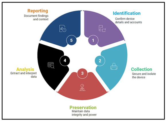 The Scientific Working Group on Digital Evidence (SWGDE) outlines a systematic process for handling IOT and digital evidence, including smartwatches for forensic examination. As depicted in their guidelines, the process begins with identification and collection, followed by preservation, analysis, and finally reporting for legal proceedings.