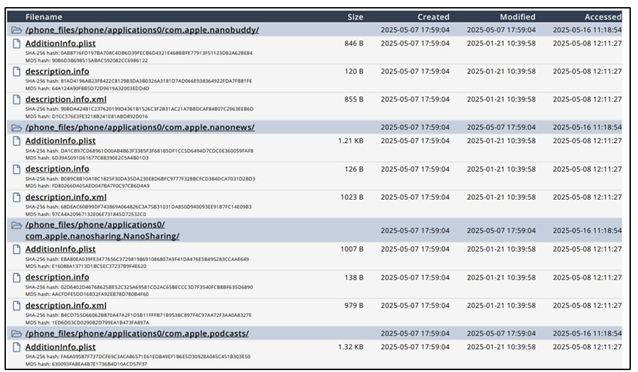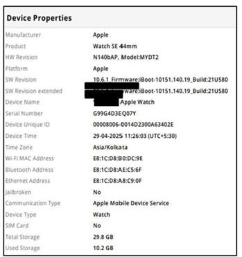 Figure 6, Package log table was extracted during the Apple smartwatch data acquisition process, listing multiple system-related modules. These include components such as App Downgrade, Bluetooth, Cell Towers, Malware Detection, and iOS Screenshot Support, each tagged with a timestamp indicating last activity or update. This metadata is valuable in forensic analysis as it helps in determining user behavior, system changes, and potential anomalies. Figure 7, shows the device properties of Apple Smartwatch including Wi-Fi MAC address, Bluetooth and Ethernet addresses, were also accessible, suggesting the device's ability to interface across multiple networks and communication environments. The report shows the absence of a SIM card, confirming the device was not cellular enabled. Time-specific parameters such as device time and time zone (Asia/Kolkata) were also recorded, essential for temporal mapping of activities. Storage metrics revealed a total capacity of 29.8 GB, of which 10.2 GB was in use.