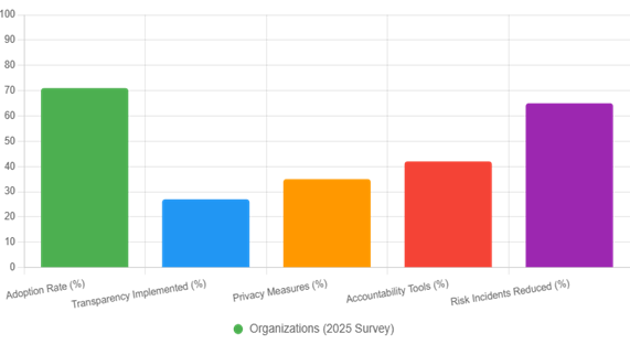 The stark disparity between adoption (71%) and governance implementation (27–42%) visually confirms the governance lag hypothesis. Despite high usage, only 27% implement transparency mechanisms (e.g., model cards, XAI), and 35% enforce privacy controls (e.g., differential privacy). However, organizations applying MLF-aligned practices report 65% fewer risk incidents (e.g., deepfakes, data leaks), suggesting a causal pathway from structured governance to harm mitigation. This finding directly addresses Objective 1.