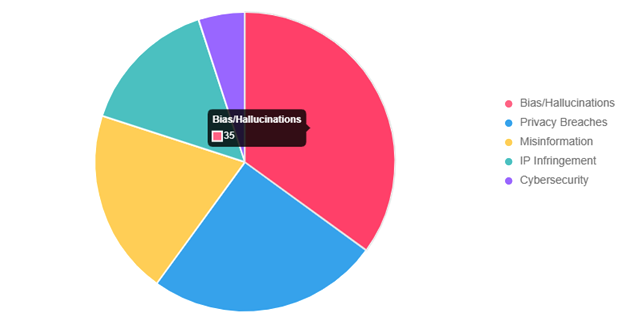 Aggregated from 1,200 documented incidents, the pie chart reveals bias and hallucinations (35%) as the dominant risk, followed by privacy breaches (25%). The MLF’s Layer 2 (Transparency) and Layer 3 (Privacy) directly target the top 60% of risk surface. Notably, IP infringement (15%) often overlooked in earlier frameworks is addressed via provenance tracking and watermarking protocols in Layer 4. This risk prioritization informs resource allocation in practice and aligns with Objective 2 (analyzing framework coverage gaps).